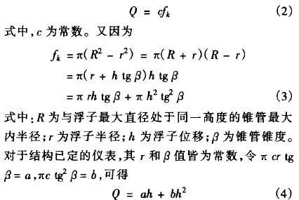 其中:Q是体积流量; α是流出系数; ?k是浮子的最大直径和相同高度锥的横截面之间的环形区域; g是重力加速度; V'是浮子的体积; ρ是浮子的密度; ρ是被测流体的密度; A是浮子的最大横截面积。
